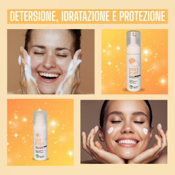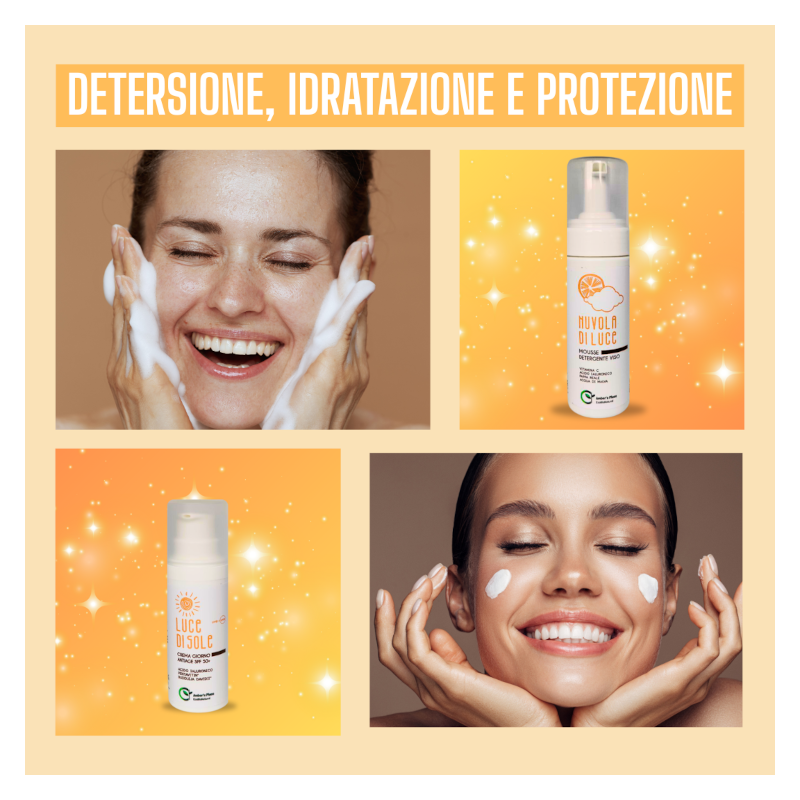 150ml - MOUSSE DETERGENTE ILLUMINANTE NUVOLA DI LUCE. Detergente pensato per illuminare l’incarnato, ridurre le macchie ed uniformare il colorito. È adatto a tutti i tipi di pelle, anche le più sensibili. Profumazione ipoallergenica, leggera e floreale.