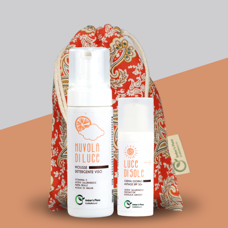 50ml - CREMA GIORNO ANTIAGE CON SPF50+ LUCE DI SOLE. Crema viso con protezione solare, adatta a tutte le tipologie di pelle, anche miste, grasse e sensibili. Se da una parte il prodotto è idratante e antiage, dall’altra garantisce un “effetto scudo” che protegge la tua pelle dai raggi UVA e UVB. La sua texture leggera e delicata si assorbe rapidamente, non unge e permette una perfetta applicazione del make-up.